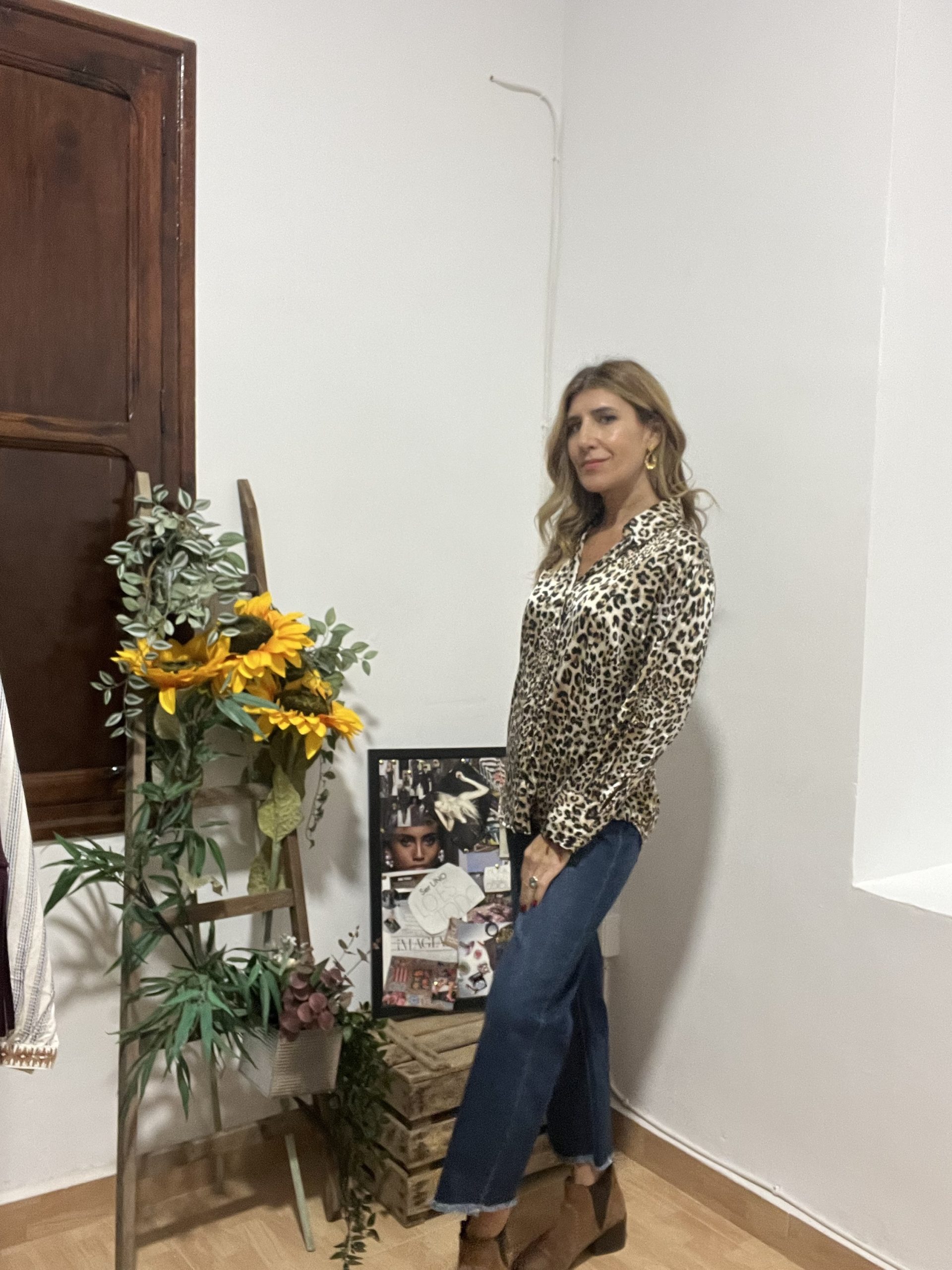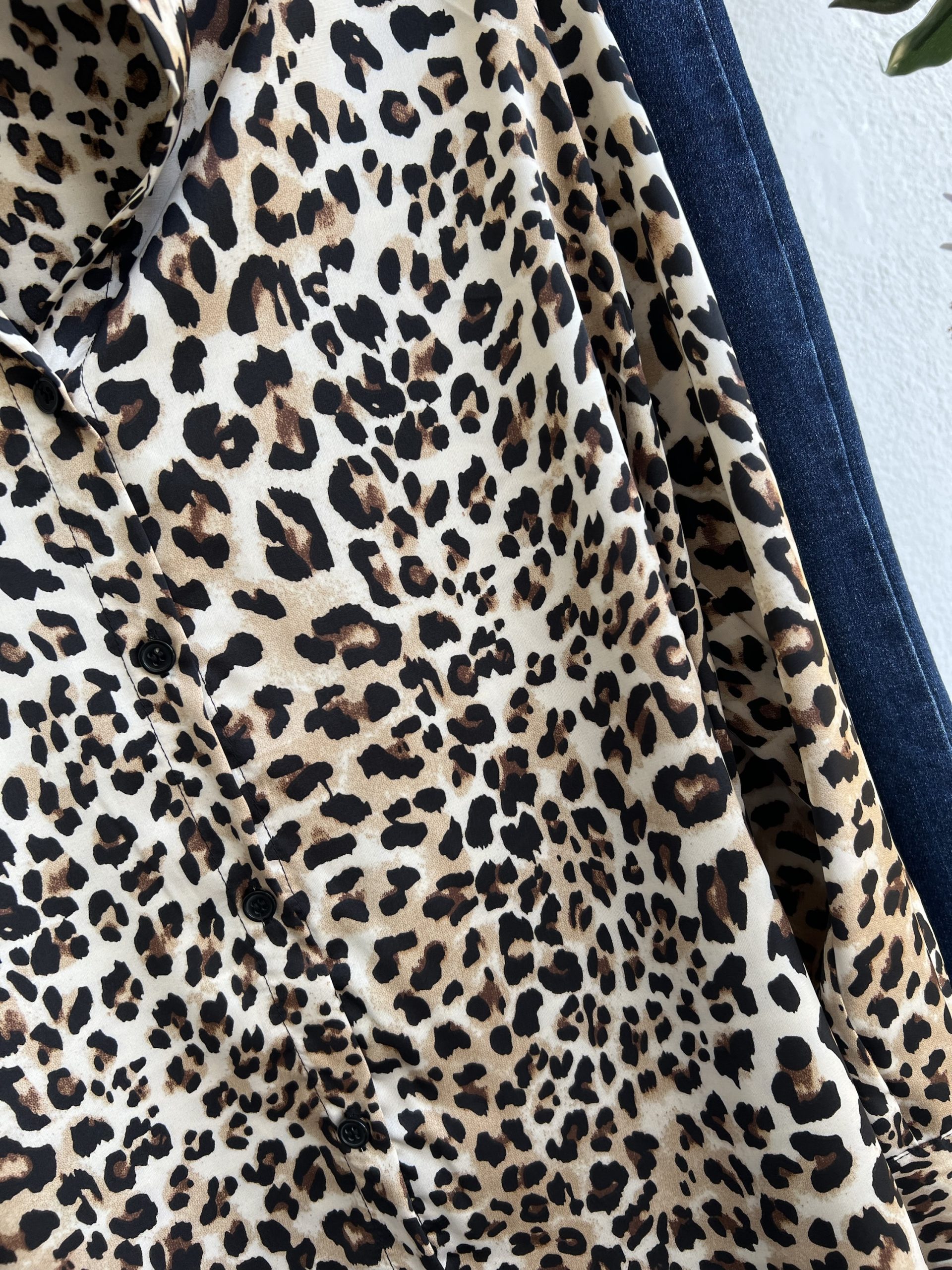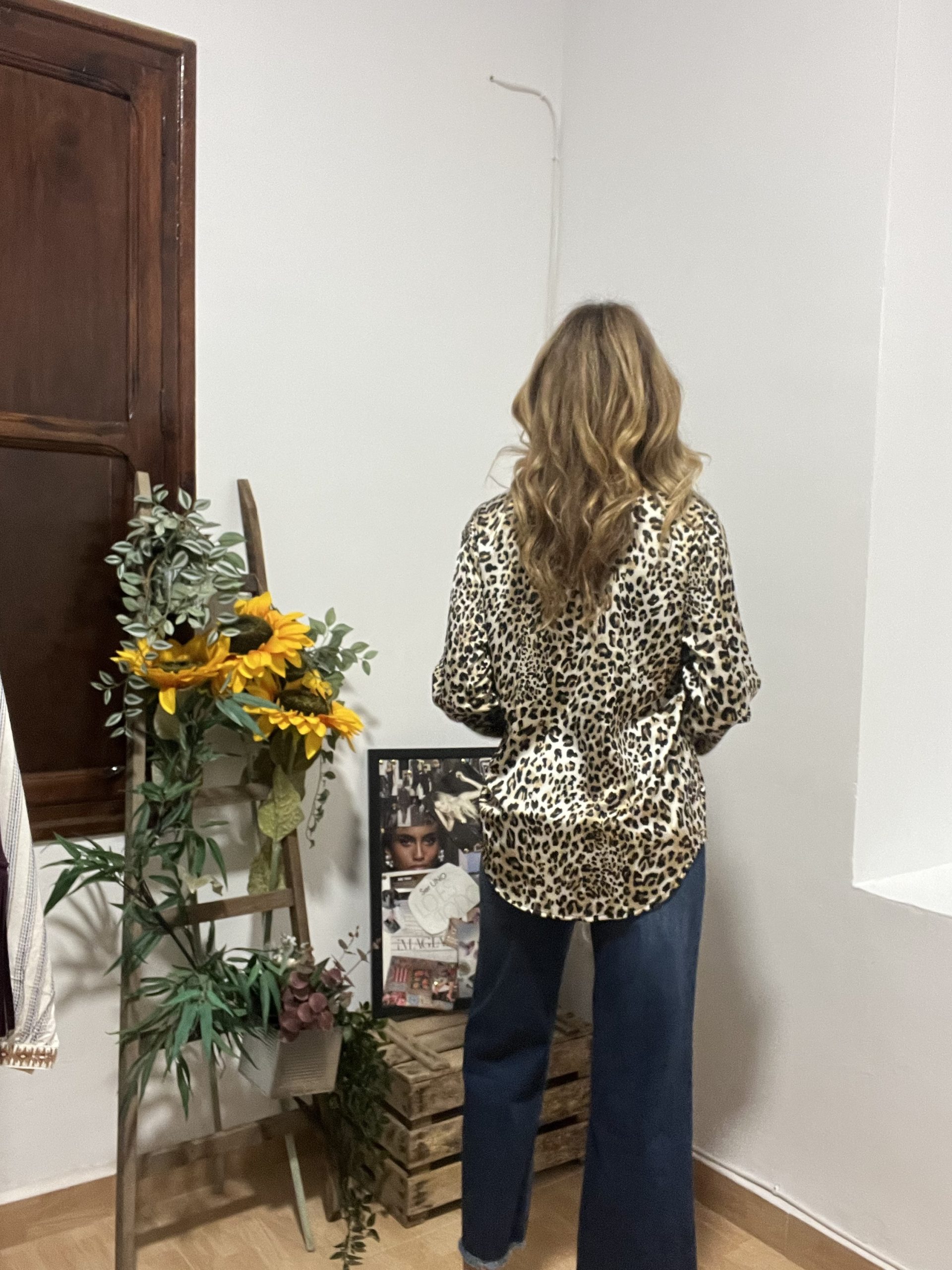 Camisa animal print satén, cuello solapa, queda suelta, botones en el puño.