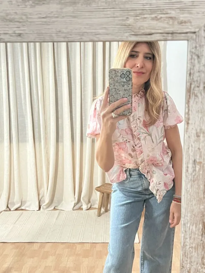 Blusa Fuensanta de flores en tonos de rosa. Tiene detalle de volante en la parte alta.