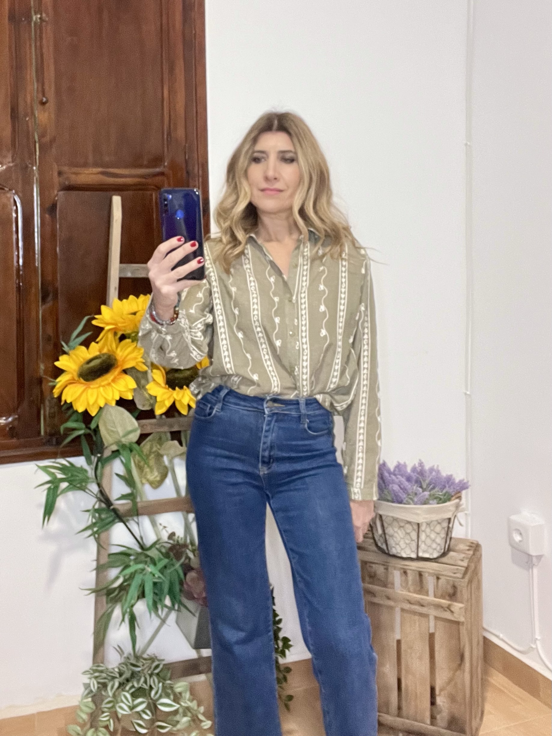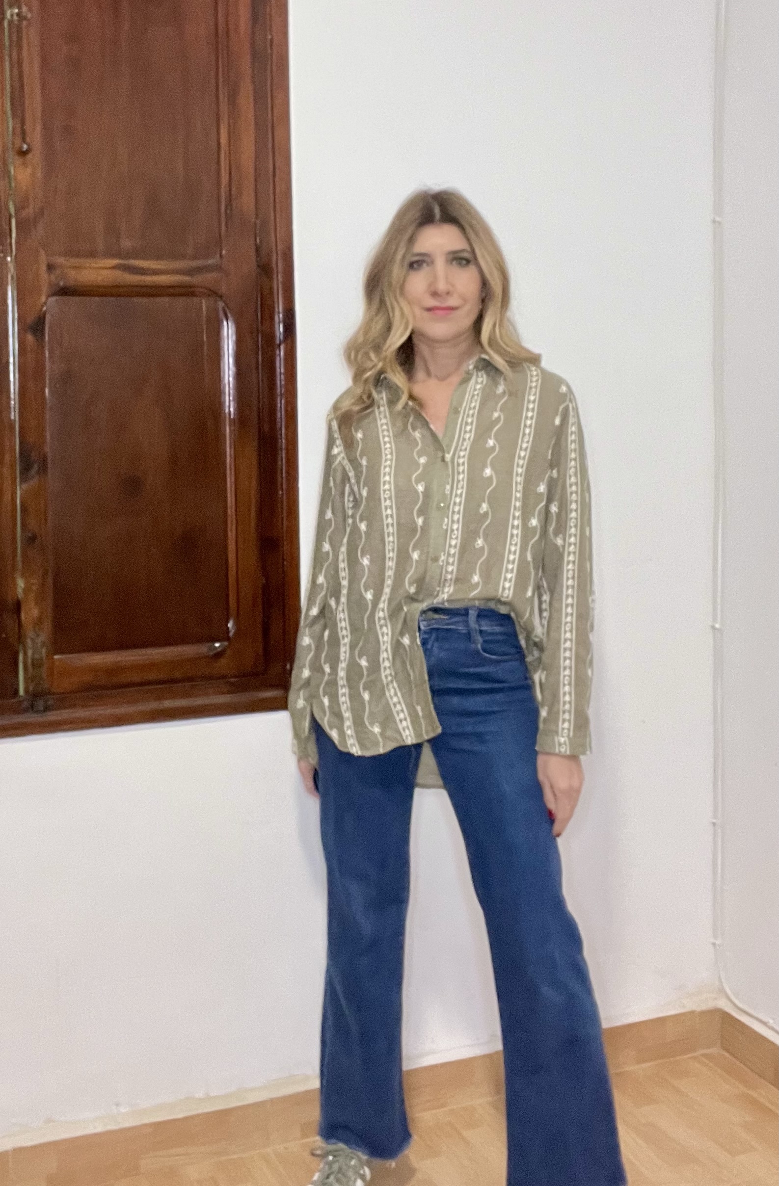 Camisa Abril con bordados, cuello solapa. Es una camisa amplia no queda ajustada. Es por talla S, M, L recomiendo tu talla habitual.