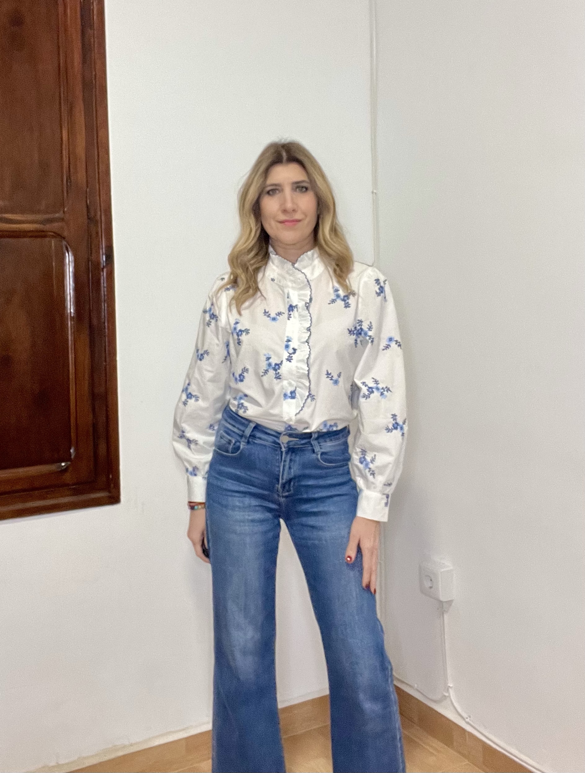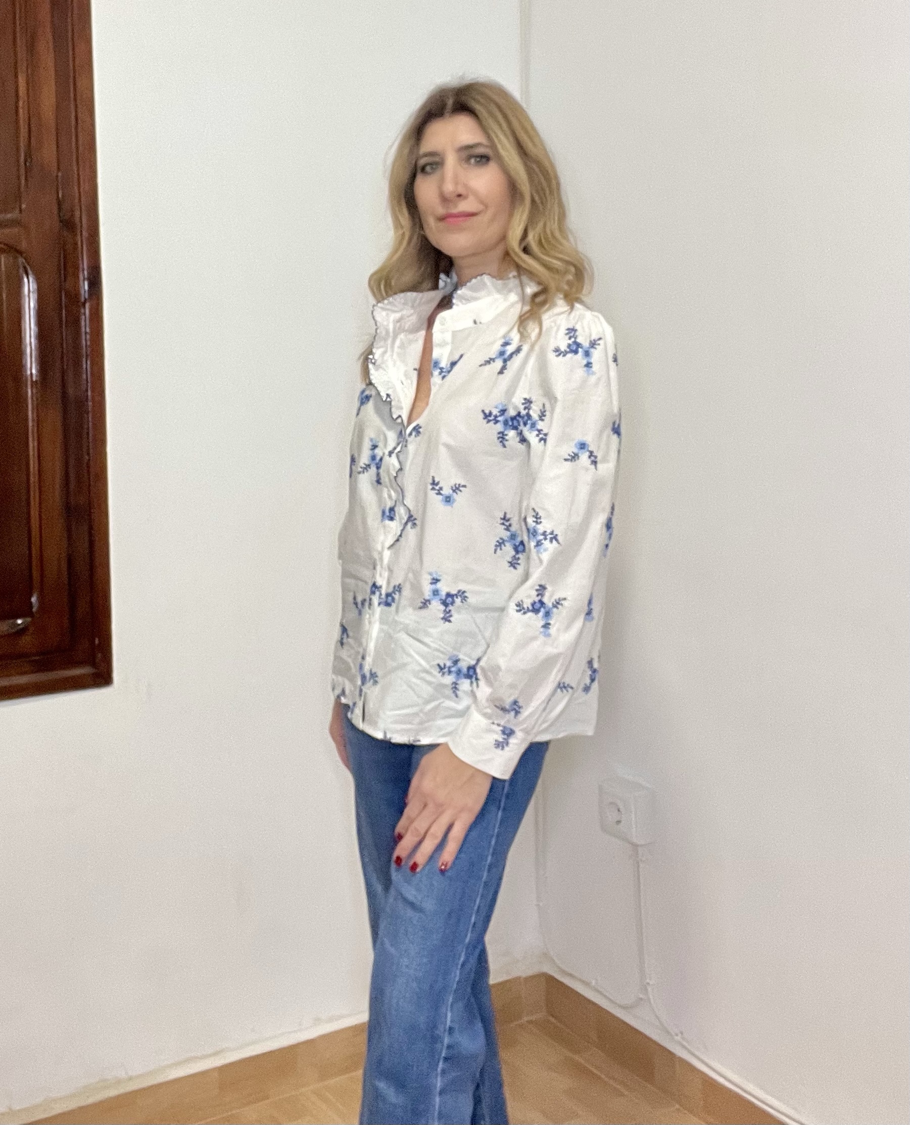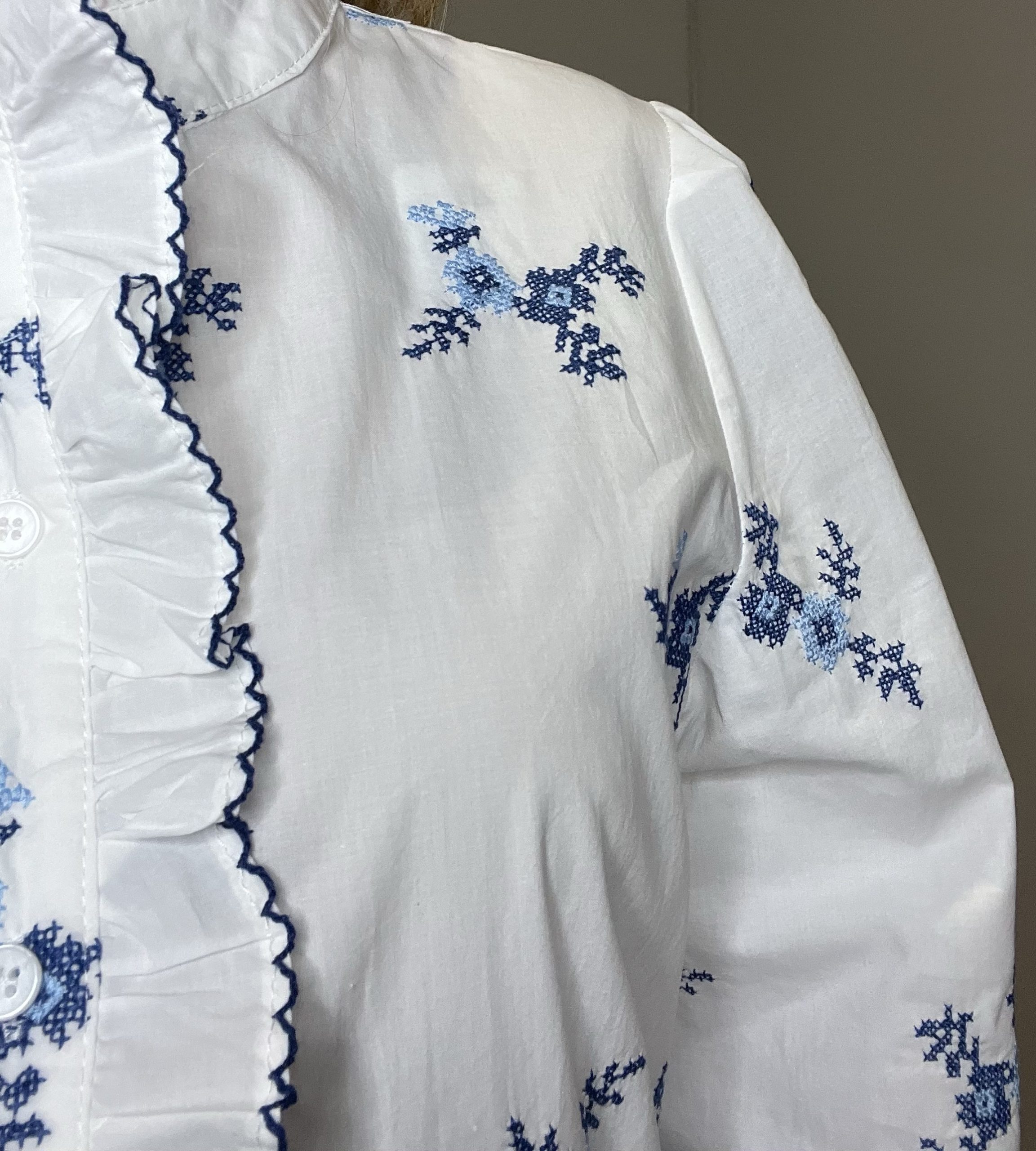 Camisa Diana, en color blanco con bordados en tonos azules. Cuello subido. Botones delanteros y la manga acaba en puño con botón.