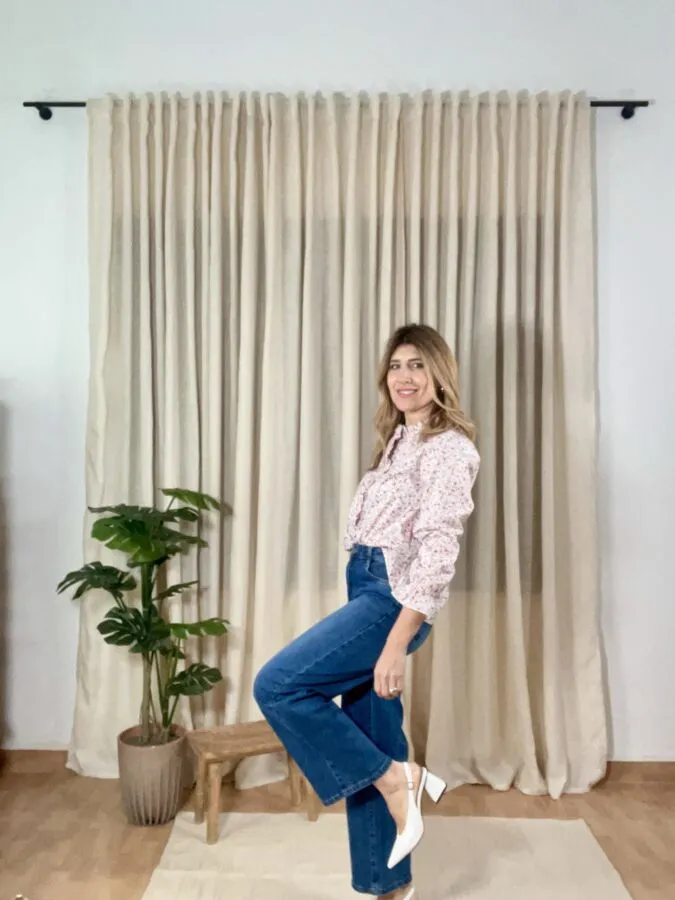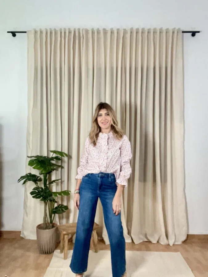 El escote en pico estiliza la figura, mientras que los botones hasta mitad del cuerpo aportan ese punto casual chic tan favorecedor. La manga termina en goma con un pequeño volante, añadiendo movimiento y un toque romántico muy sutil.
