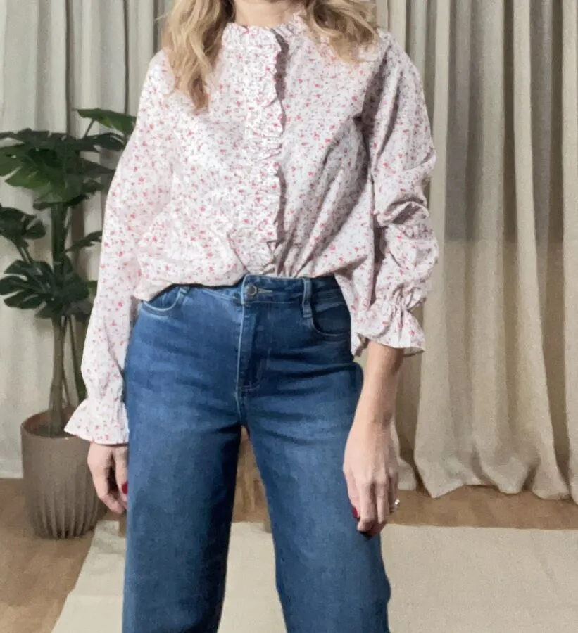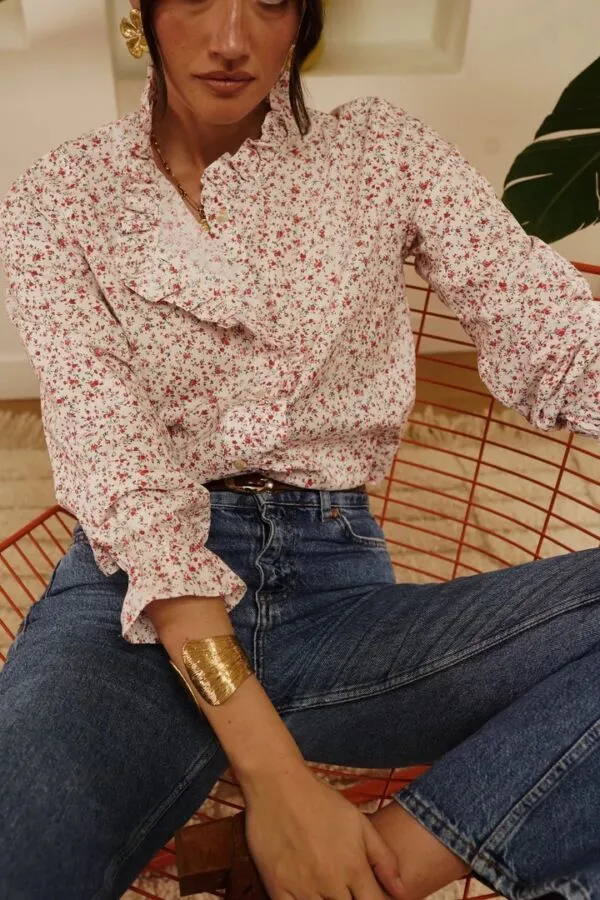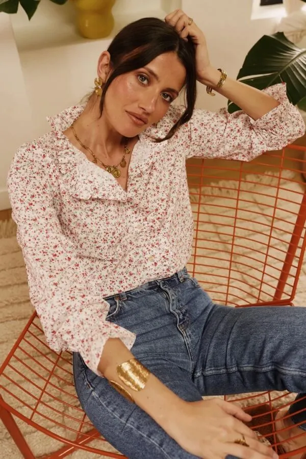 Ligera, femenina y con ese aire effortless que tanto nos gusta. Esta camisa de base blanca con delicado estampado de pequeñas flores rojas es perfecta para dar luz al rostro y elevar cualquier look sin esfuerzo.