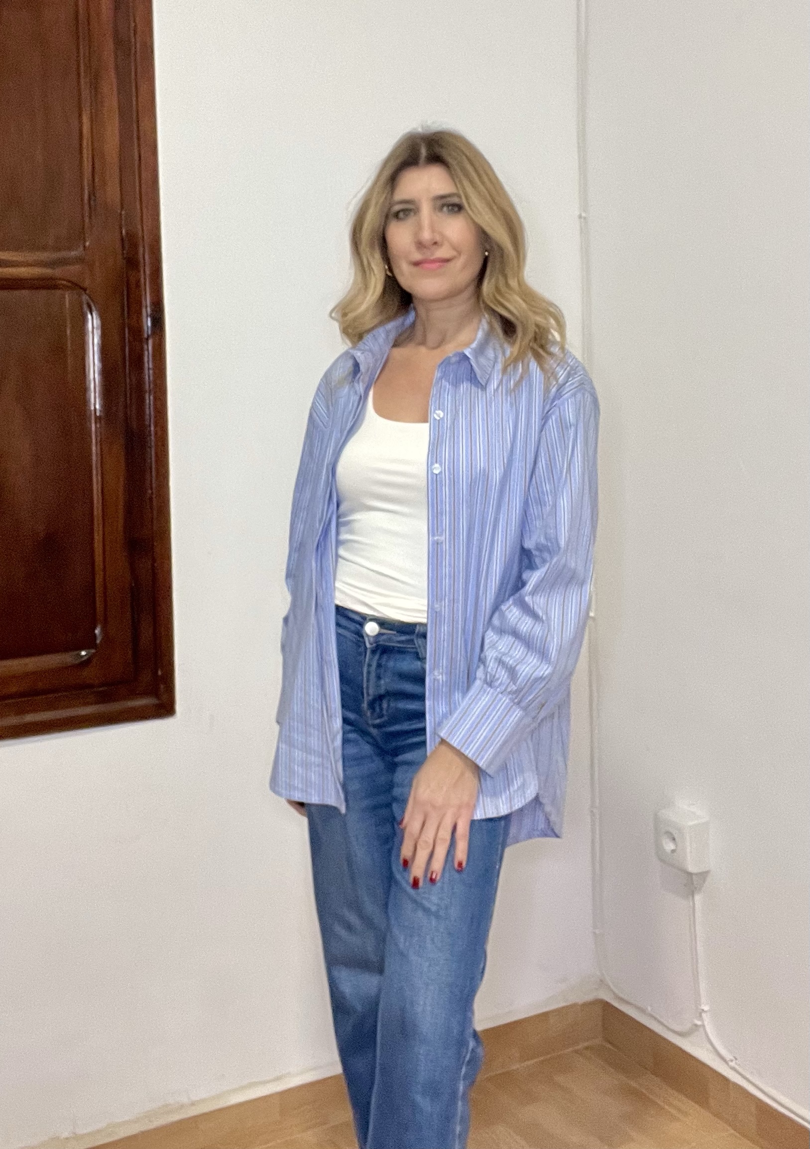 Camisa Daniela, patrón masculino, oversize. Botones en la parte de alante, cuello solapa y la maca acaba en puño con botón.