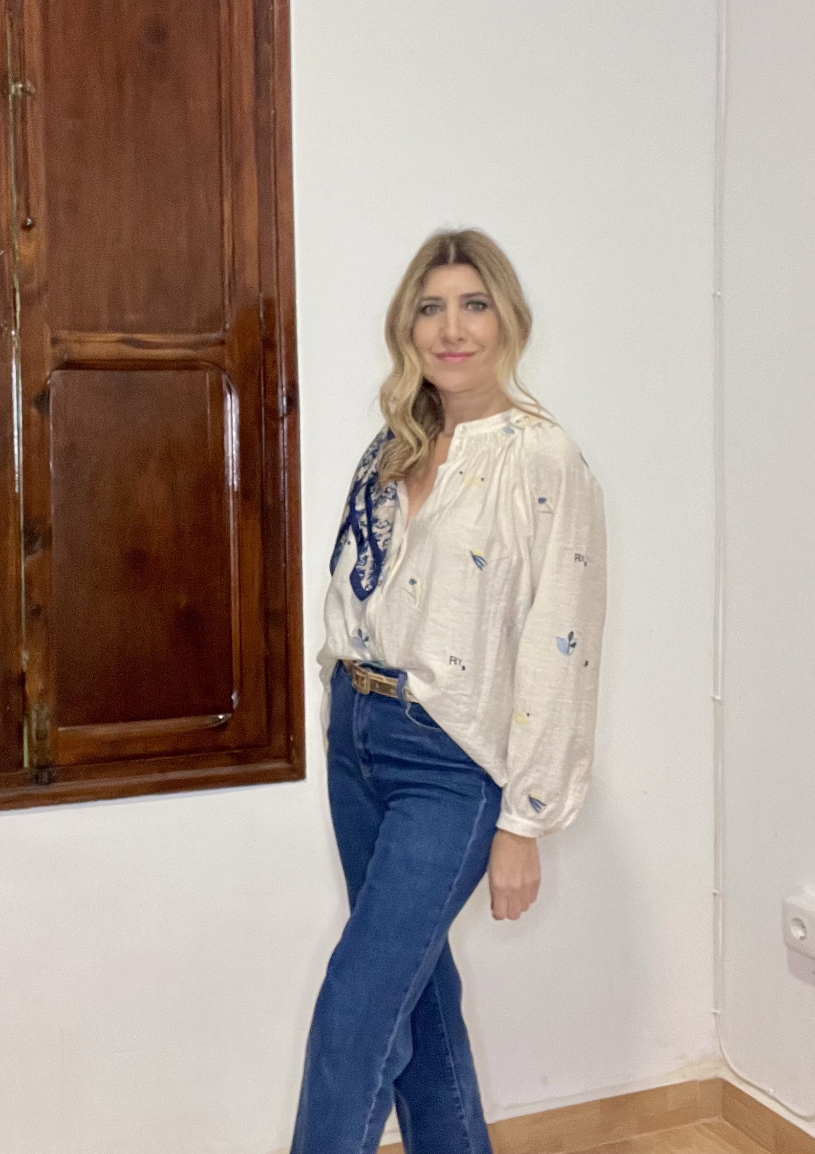 Blusa Iria, cuello pico con botones delanteros, color blanco roto con detalles bordados en colores alegres. Es una blusa amplia, queda suelta.