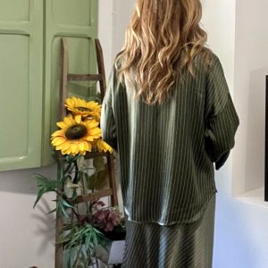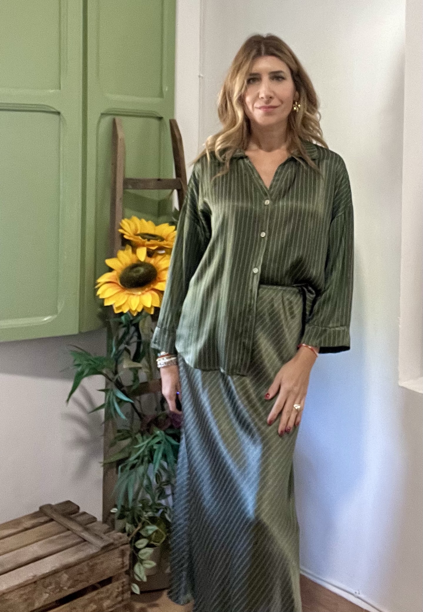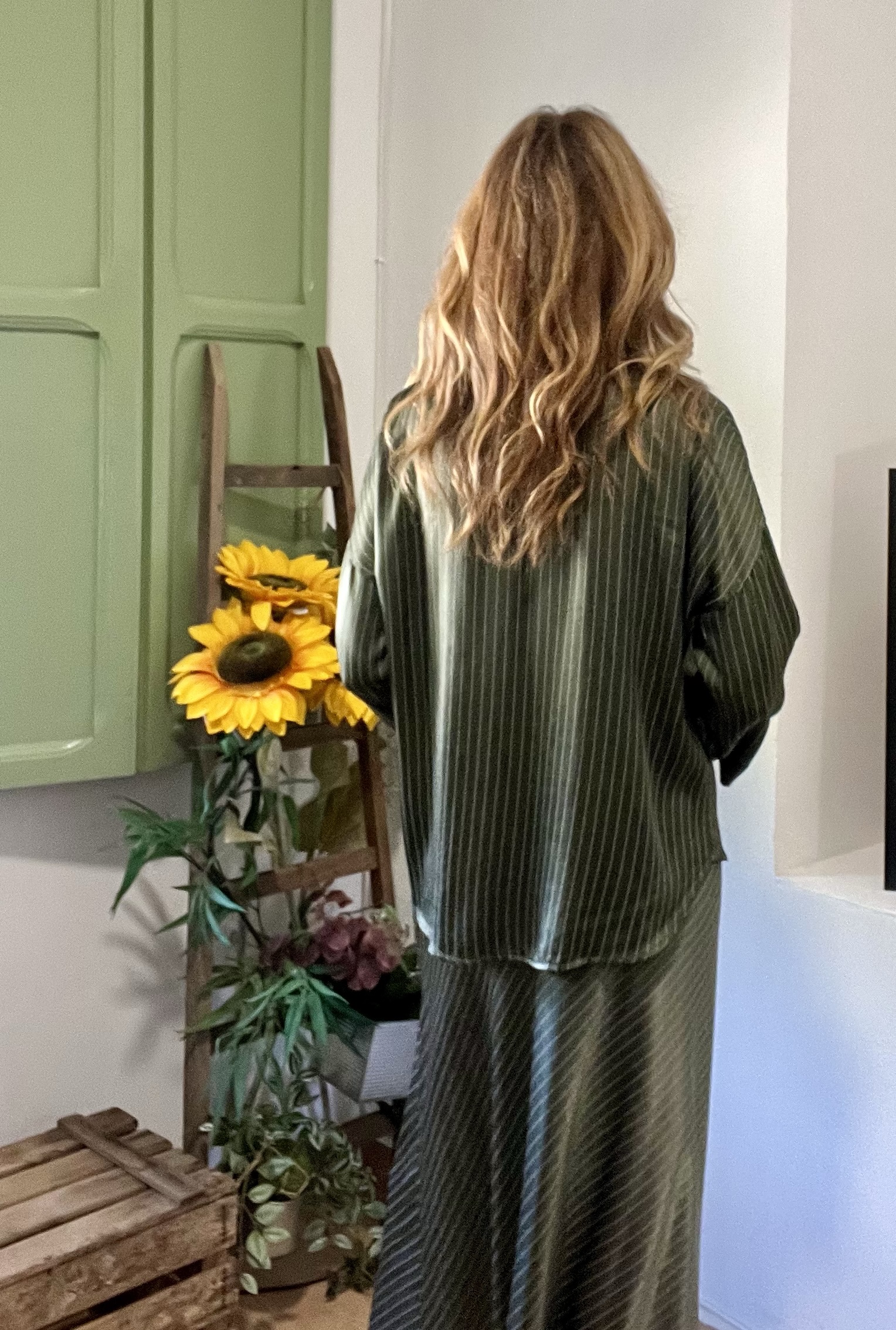 Camisa tipo blusa, con raya finita en color verde con raya en blanco
