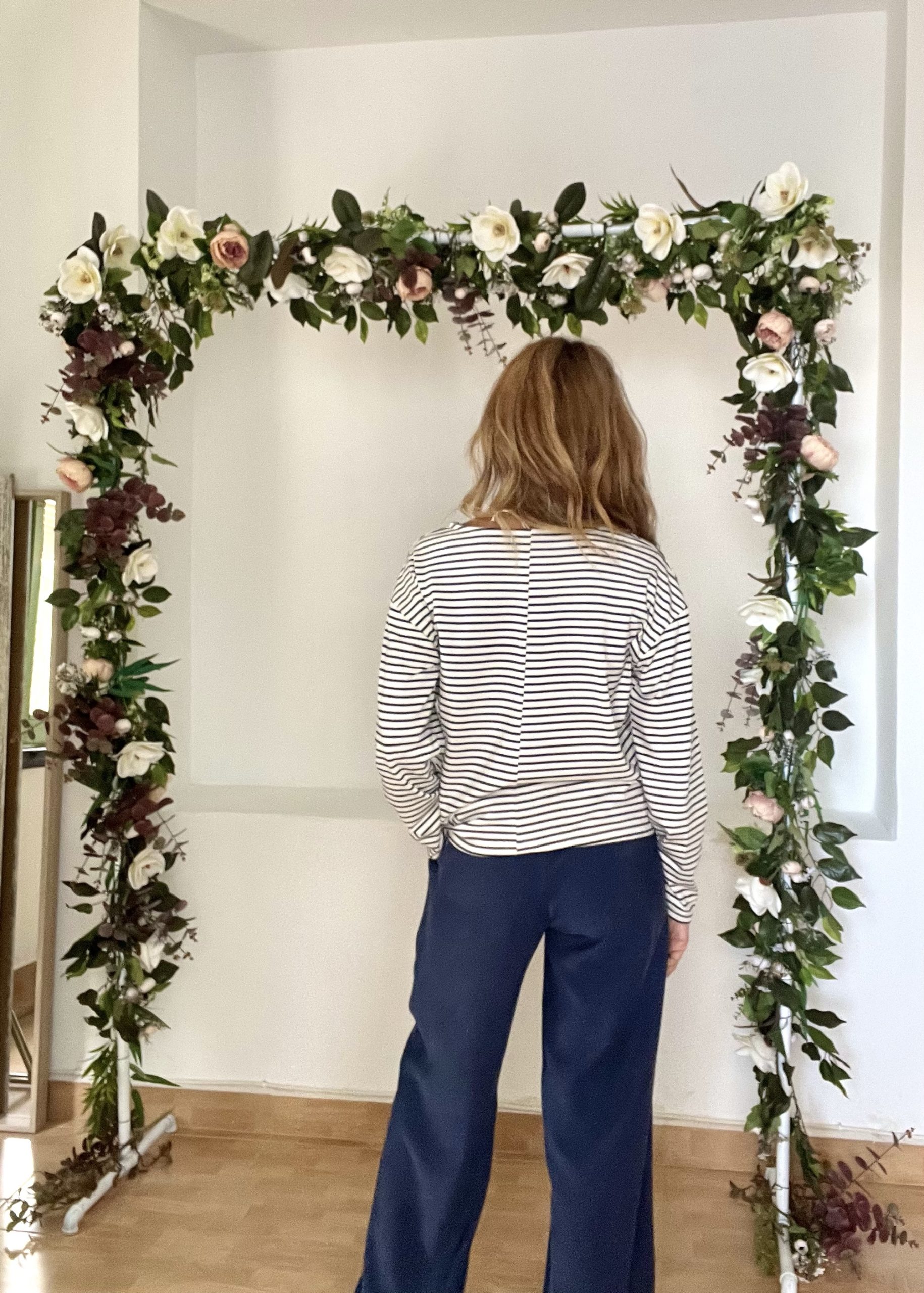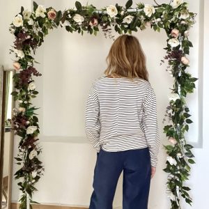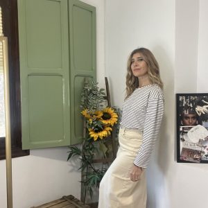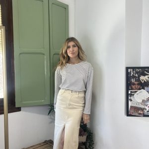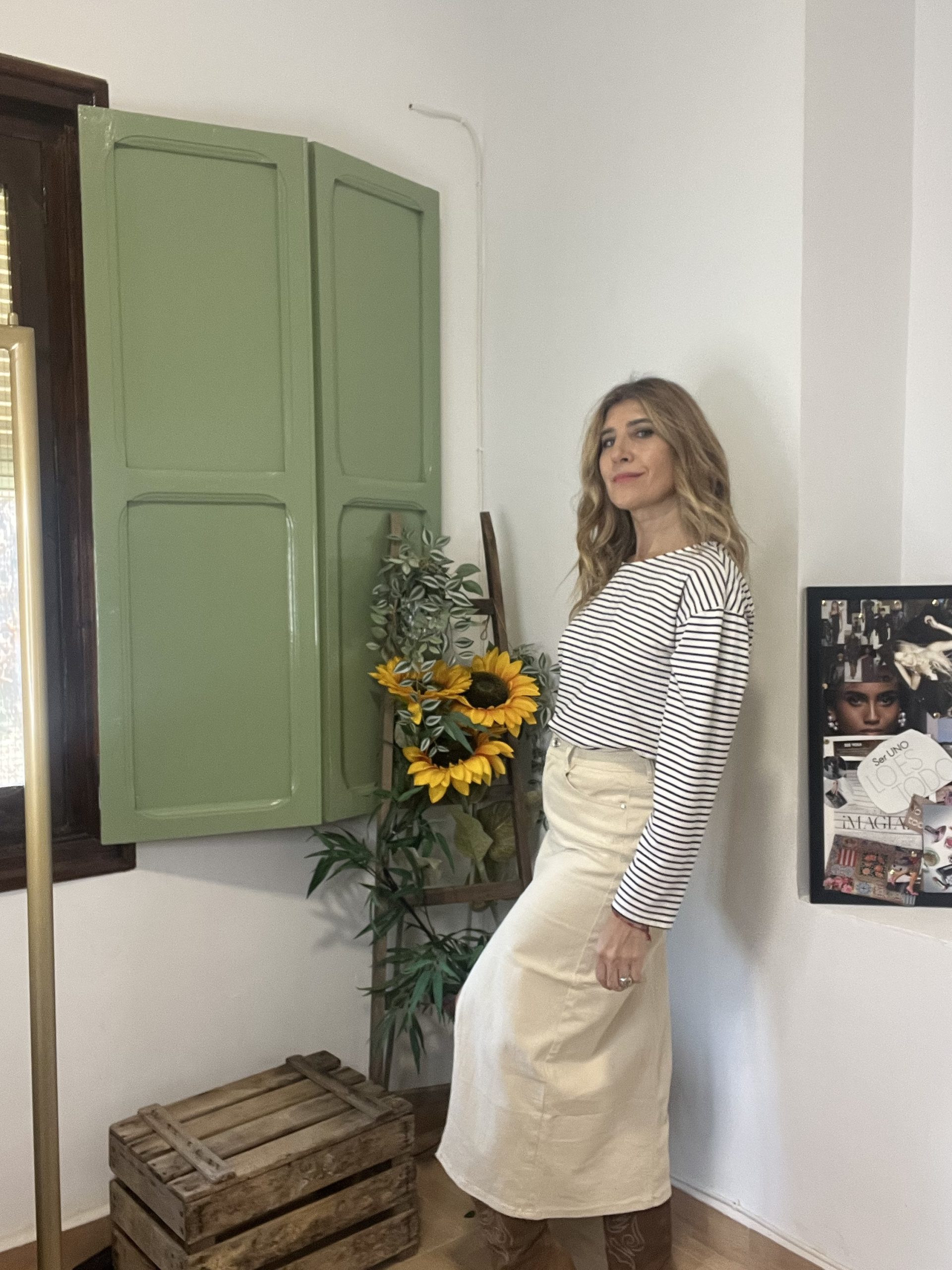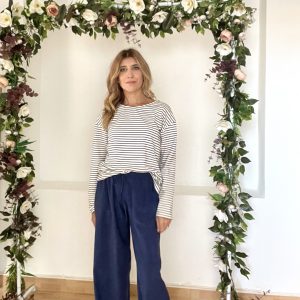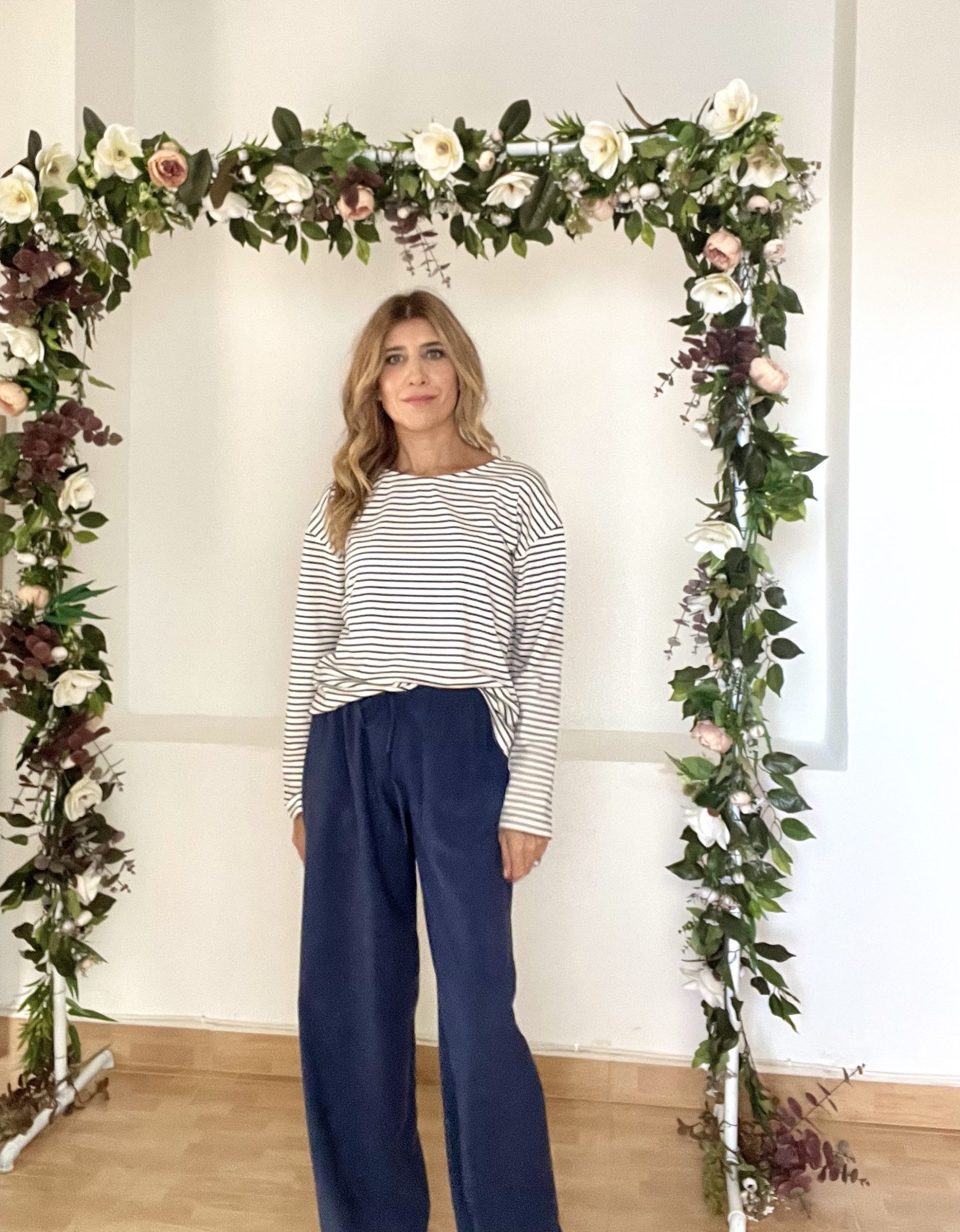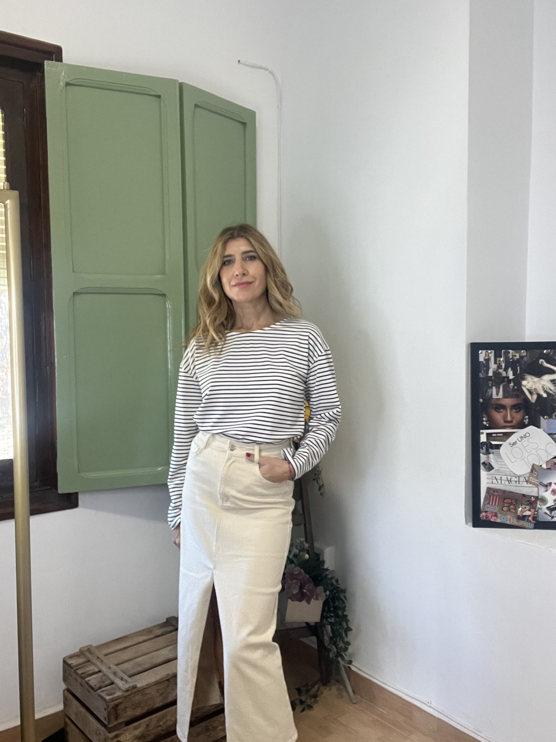 Camiseta rayas navy, base en blanco, con raya en azul marino, queda suelta, cubre talla desde la talla 36 hasta una 42