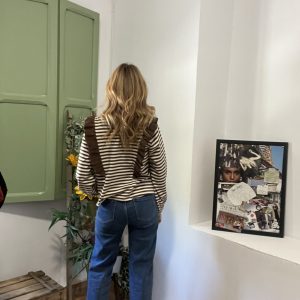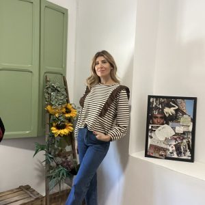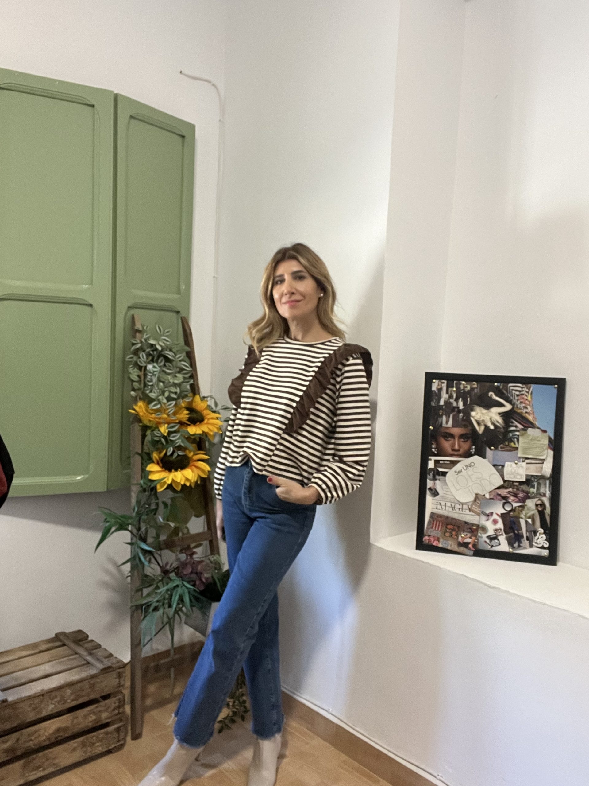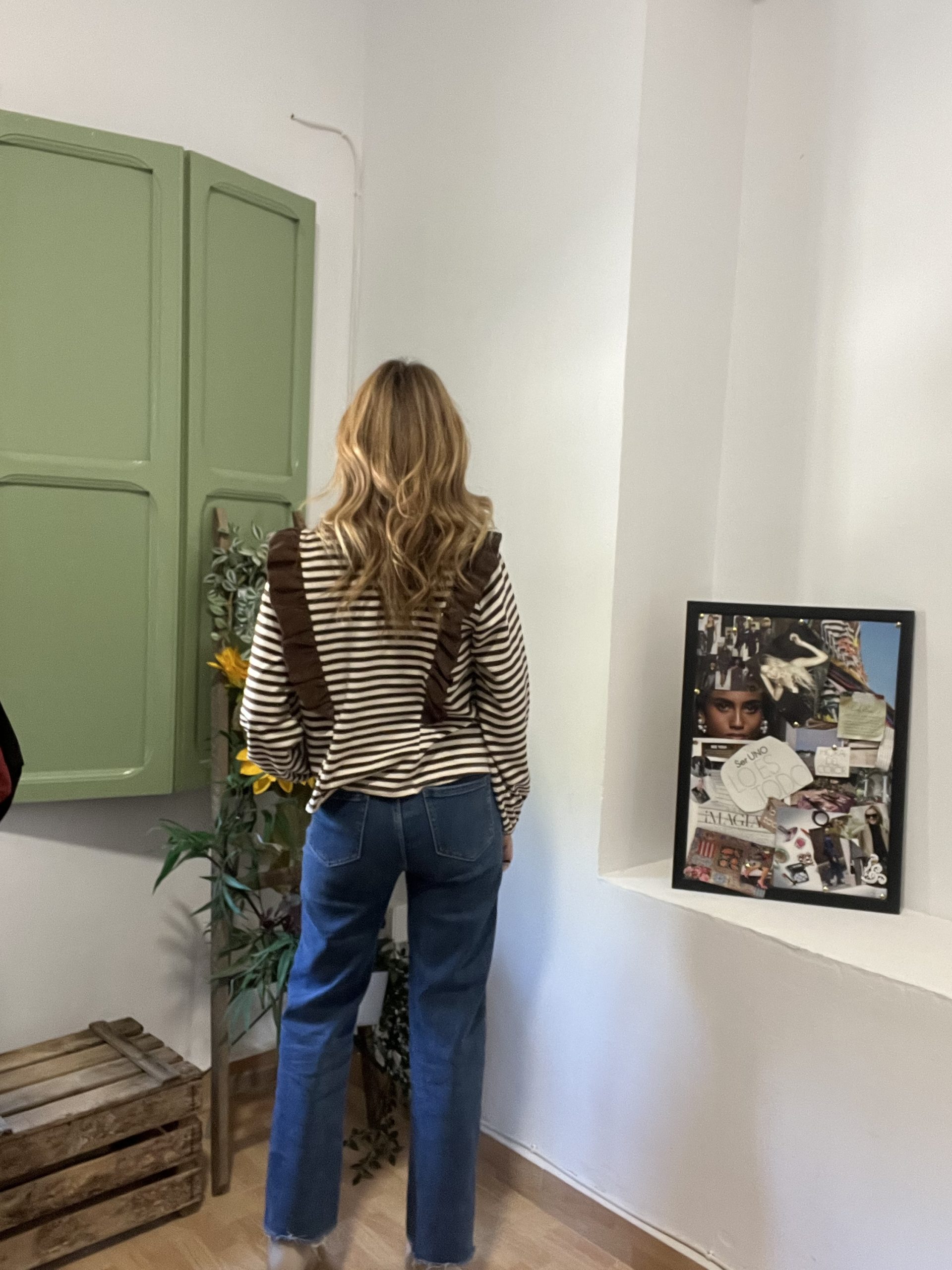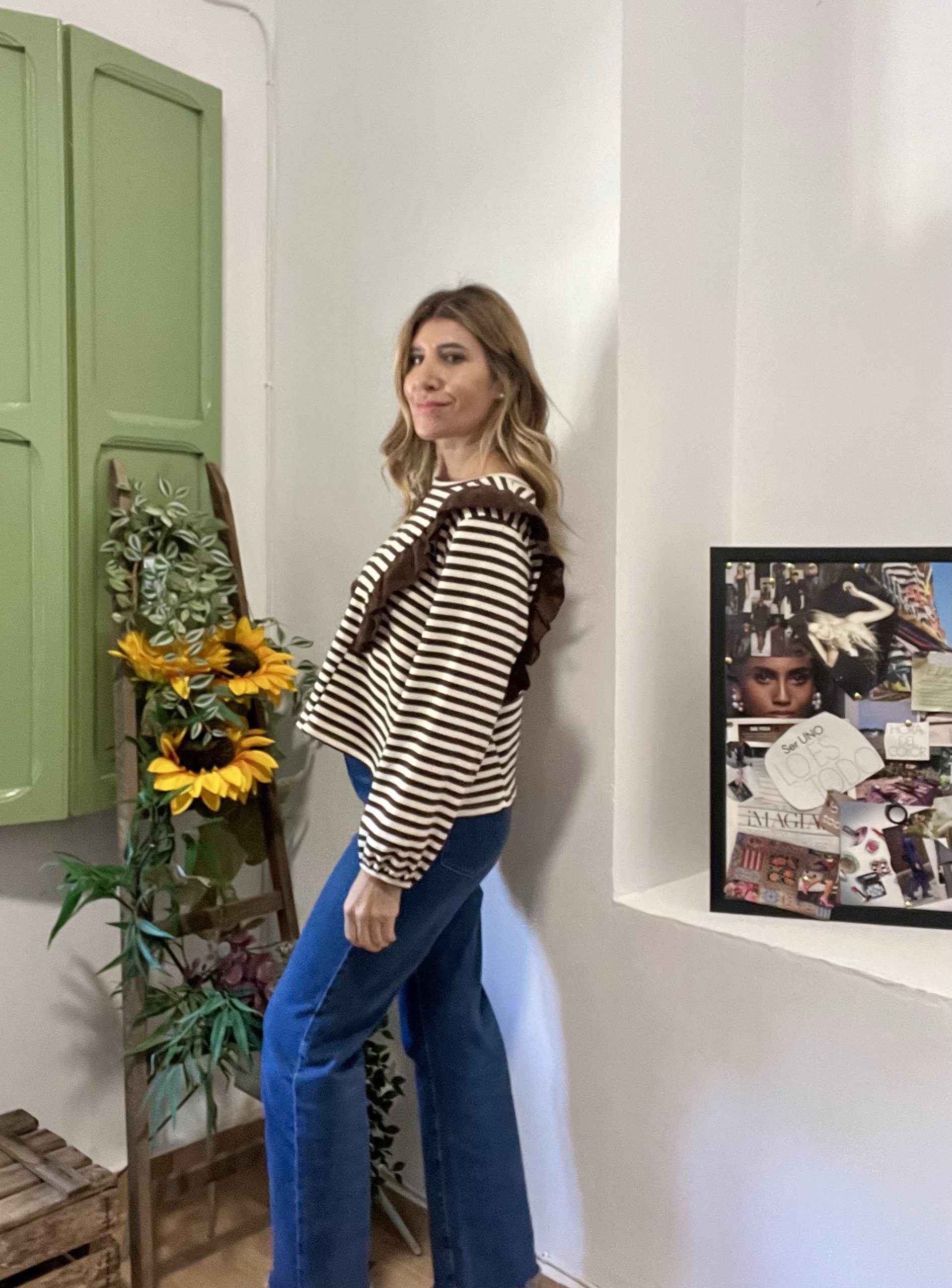 Camiseta rayas, detalle volante en pana marrón chocolate
