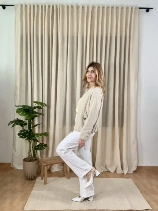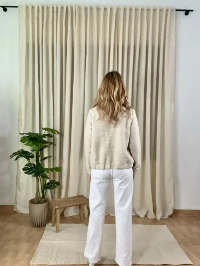 Cazadora Liberty en color crudo, tejido como de tweed, es cómoda y funcional.