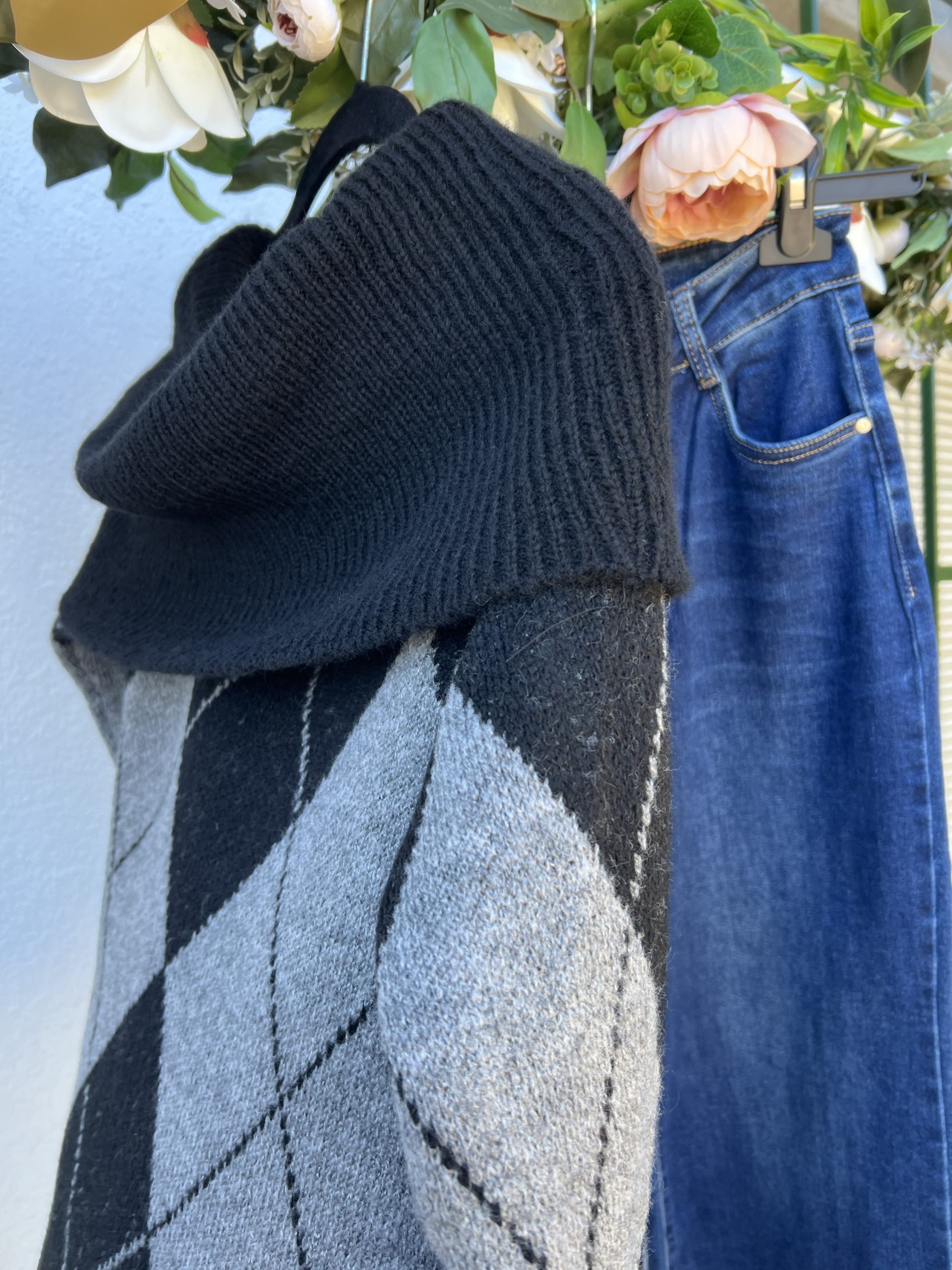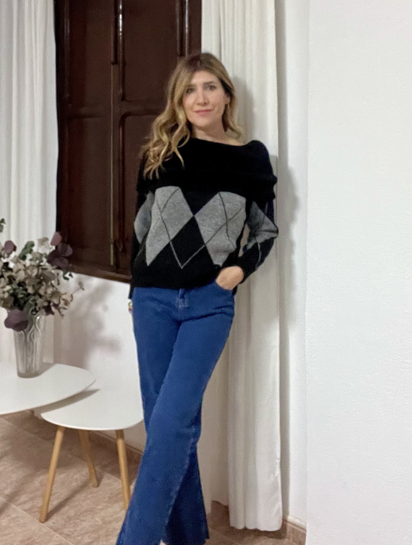 Jersey escote Bardot color negro con rombos en gris