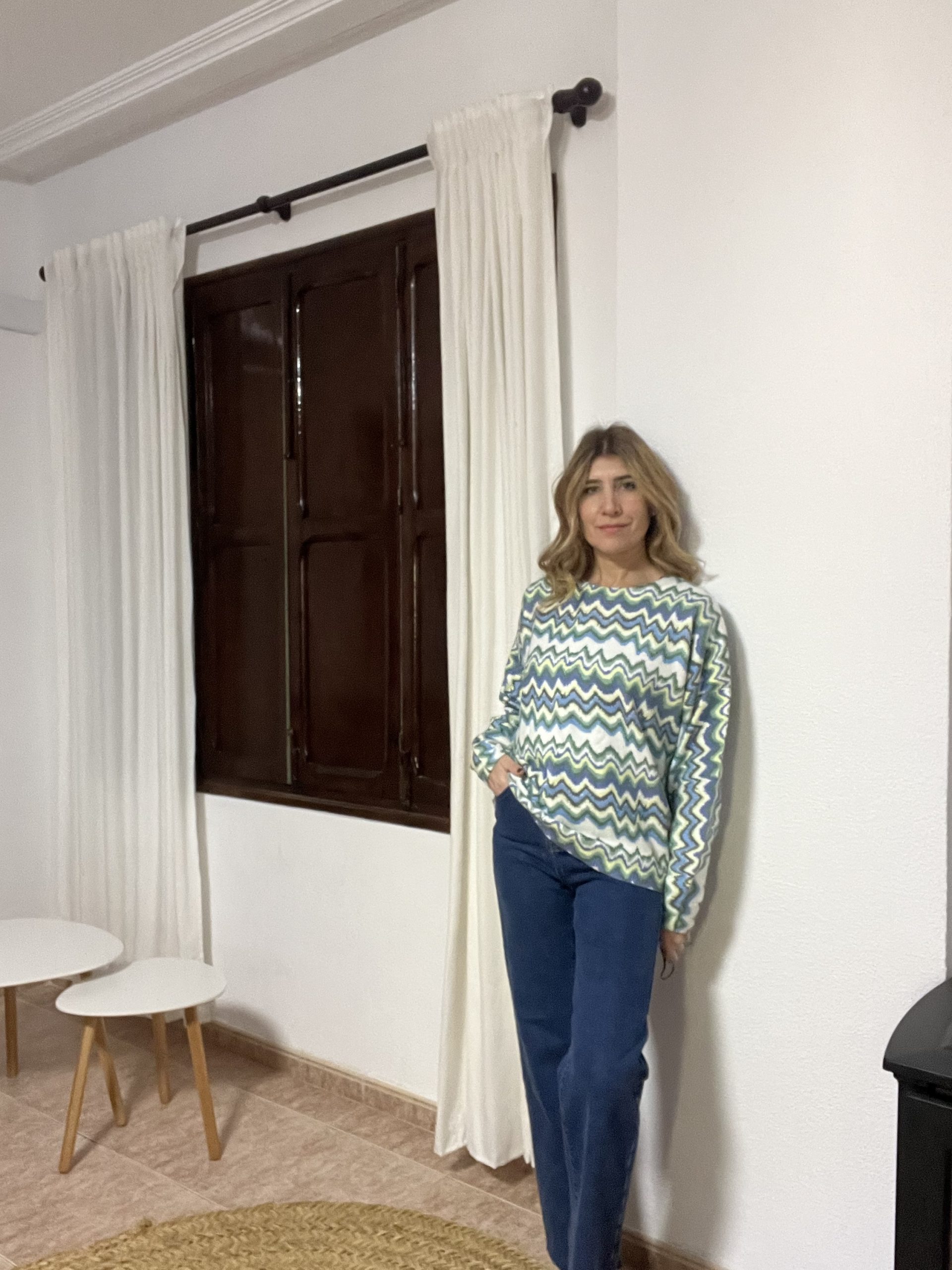 Jersey con cenefas en tonos de verde y rosas