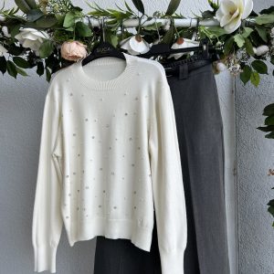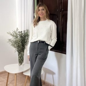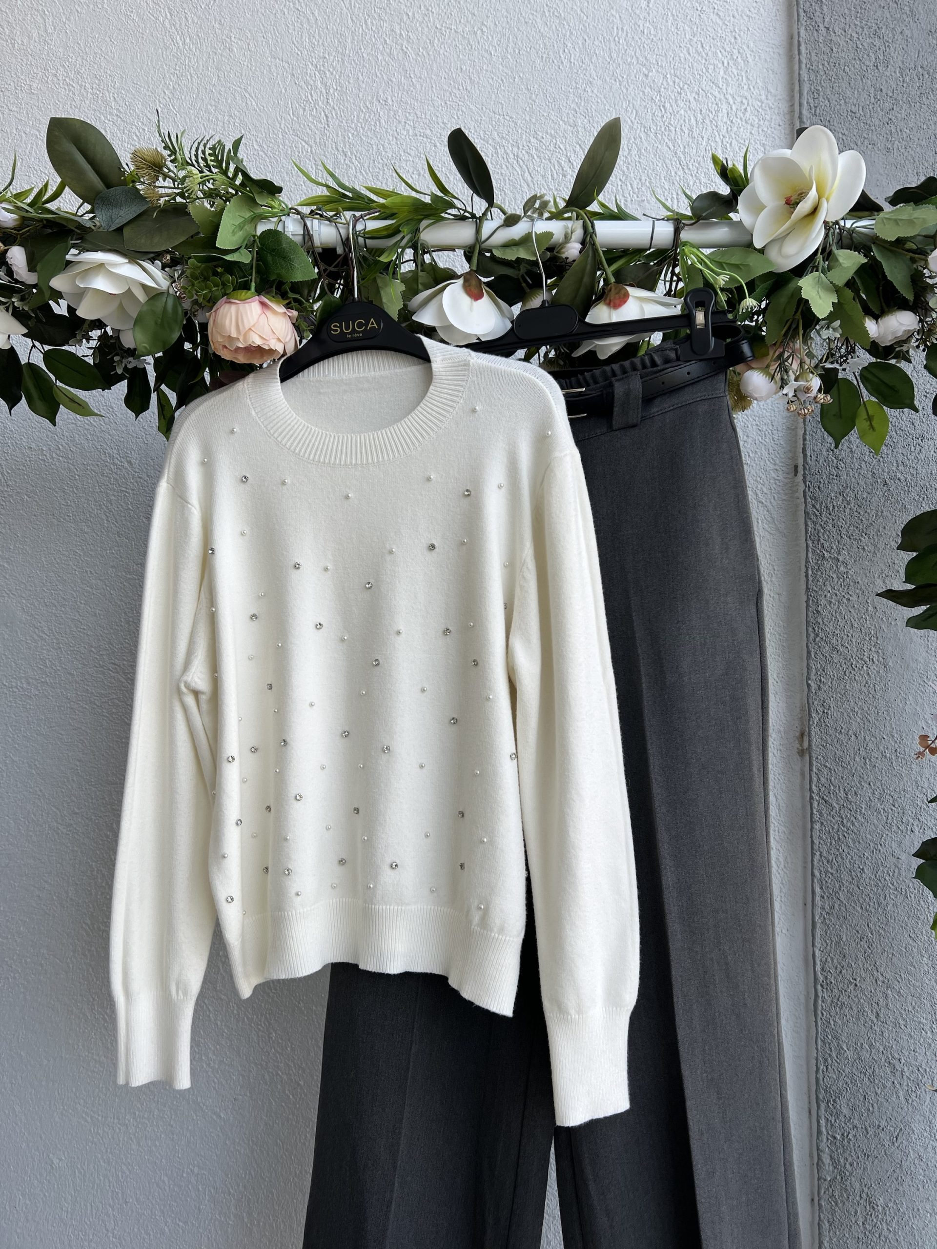 Jersey cuello caja, tacto súper agradable. Cuello caja, detalle en la parte delantera de perlas y brillantitos