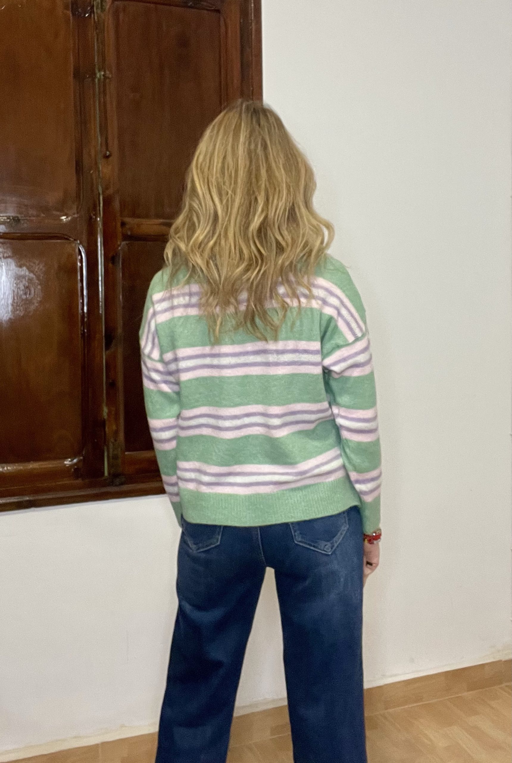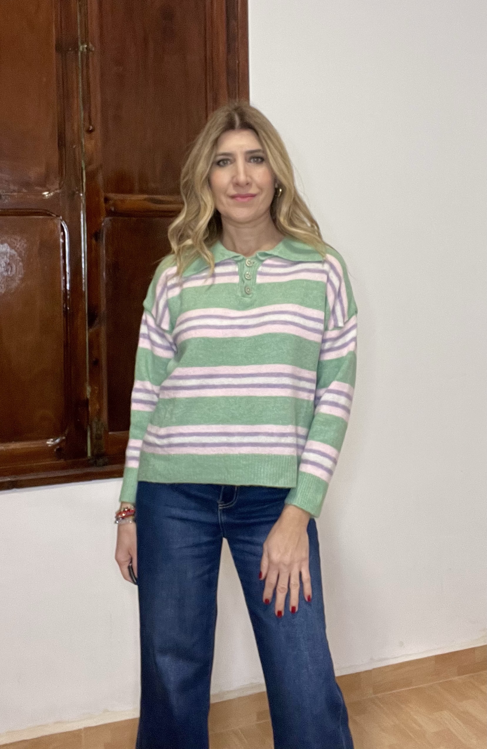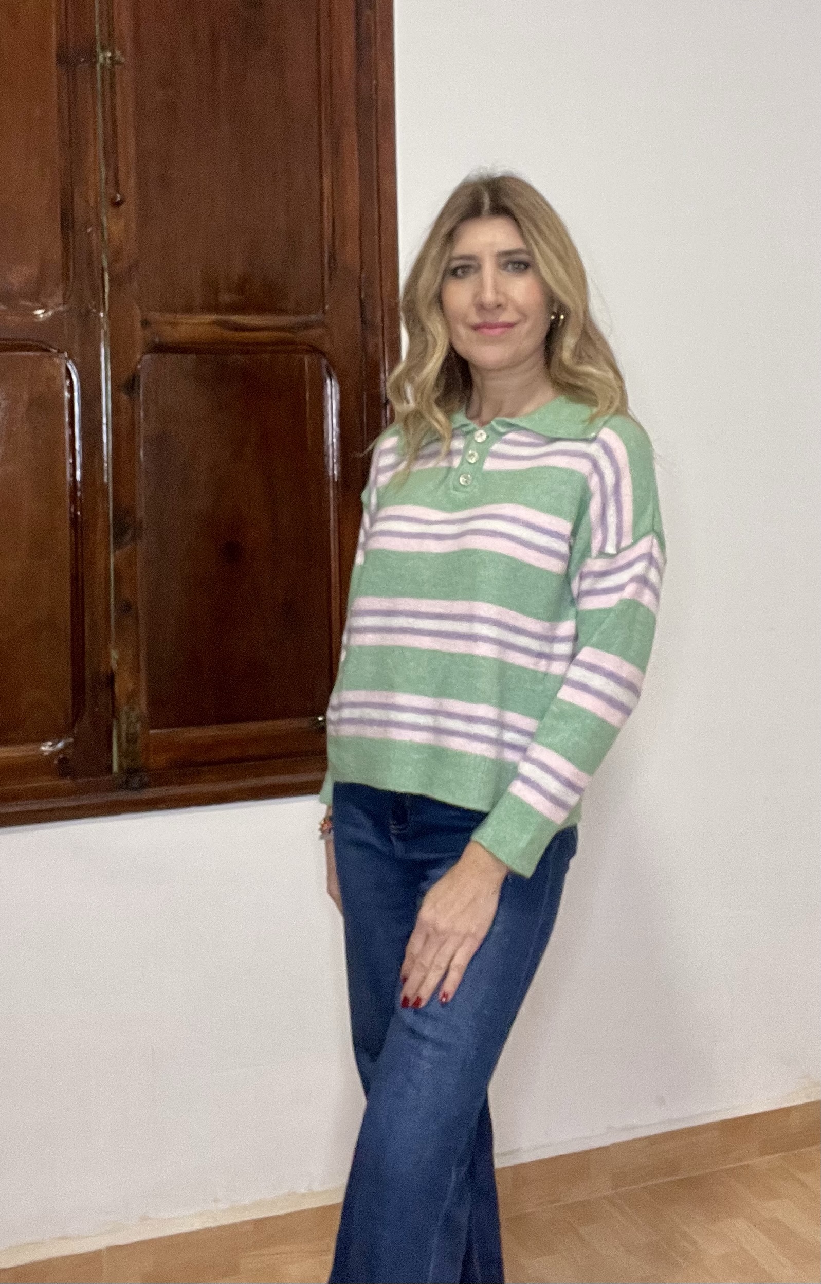 Cuello polo,tejido punto, rayas en tonos verde con dos tonos de malva, lila