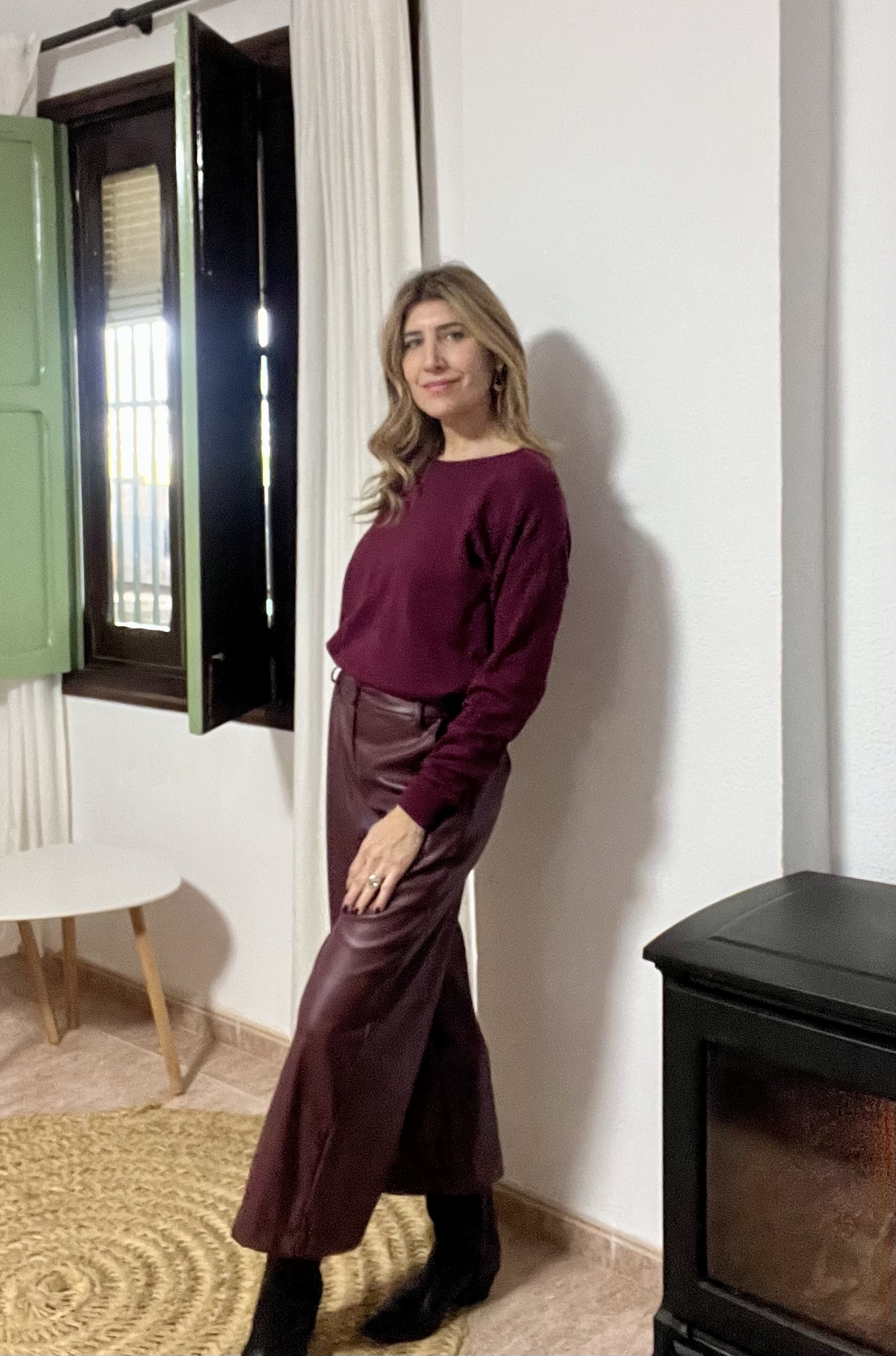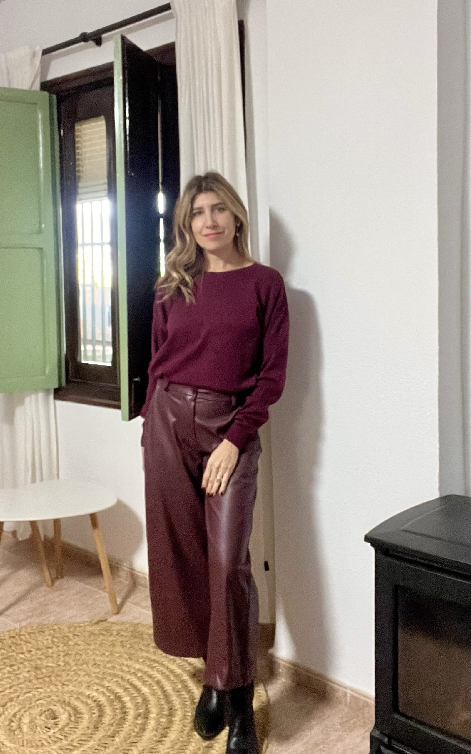 Pantalón polipiel color burdeos