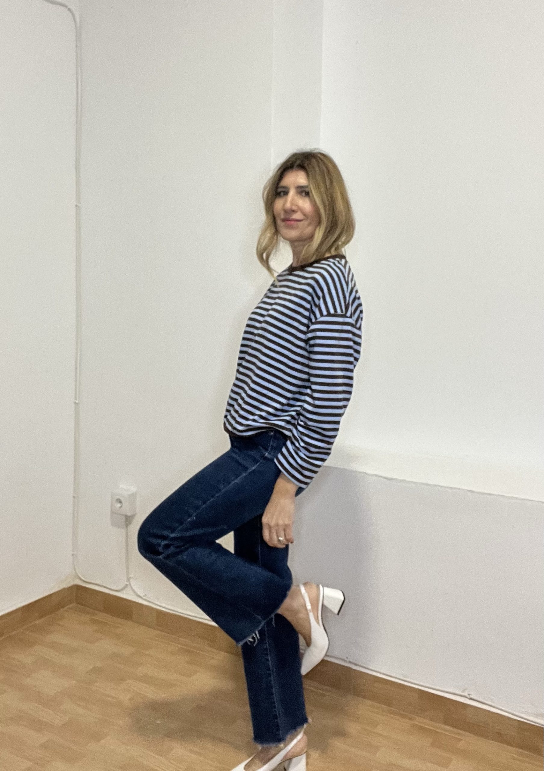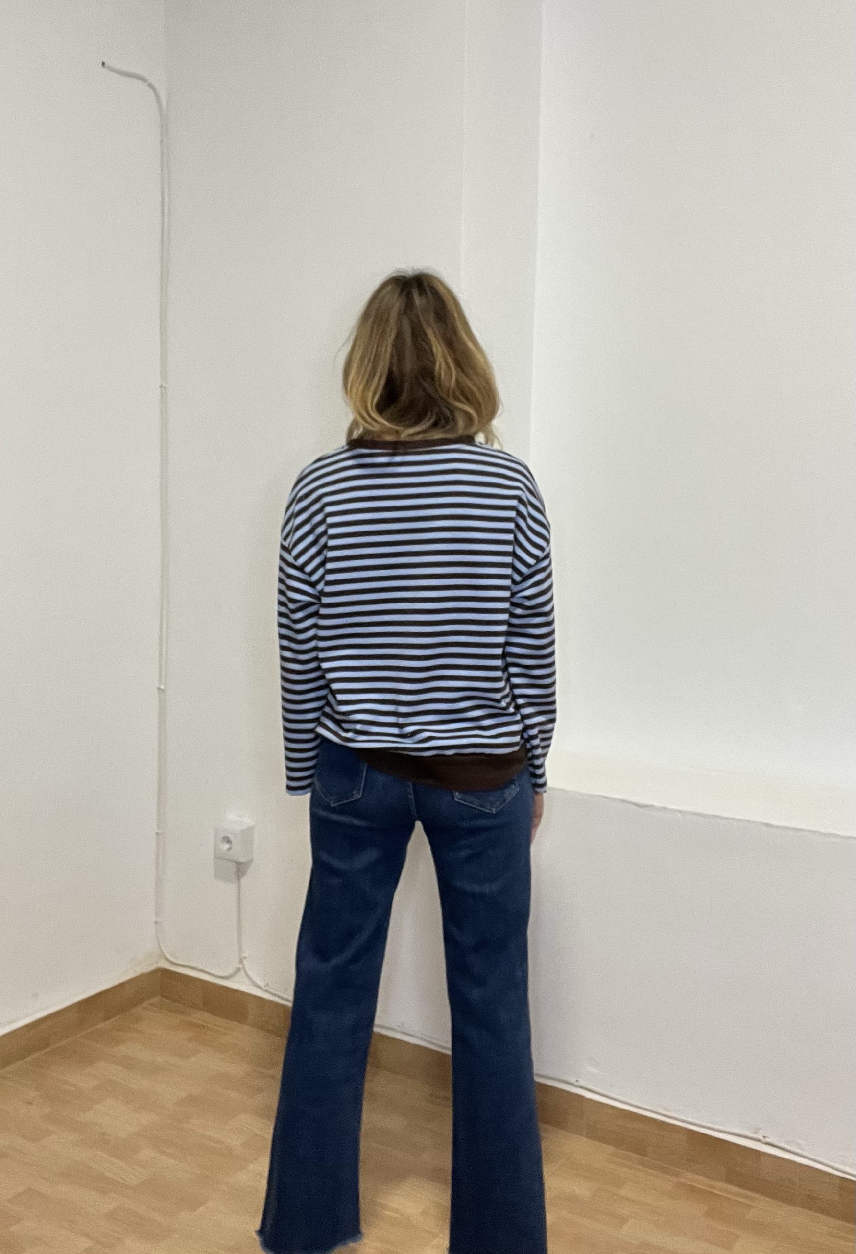 Diseñada en rayas granate y frambuesa, con cuello y bajo en color granate que aportan estructura y contraste. Su corte suelto la hace perfecta para llevar con tejanos y crear looks relajados pero con estilo.