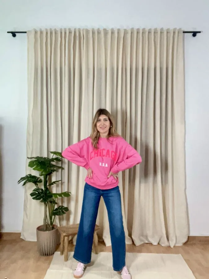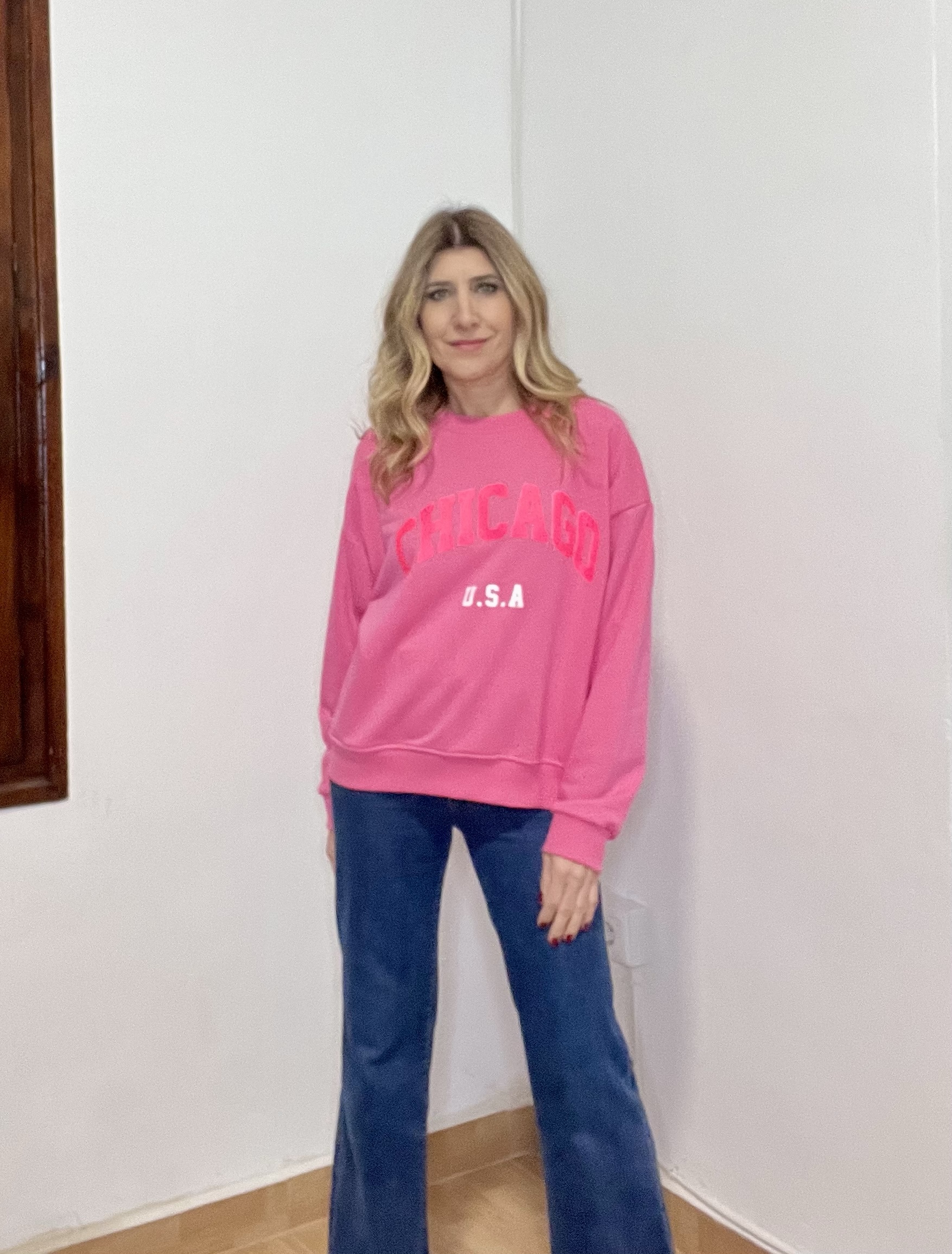 Sudadera de felpa sin forrar, en color fucsia con letras en la parte central «CHICAGO»