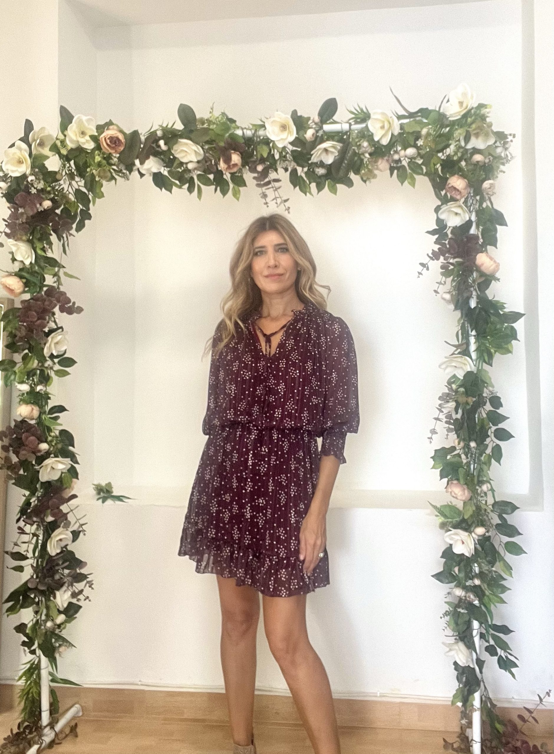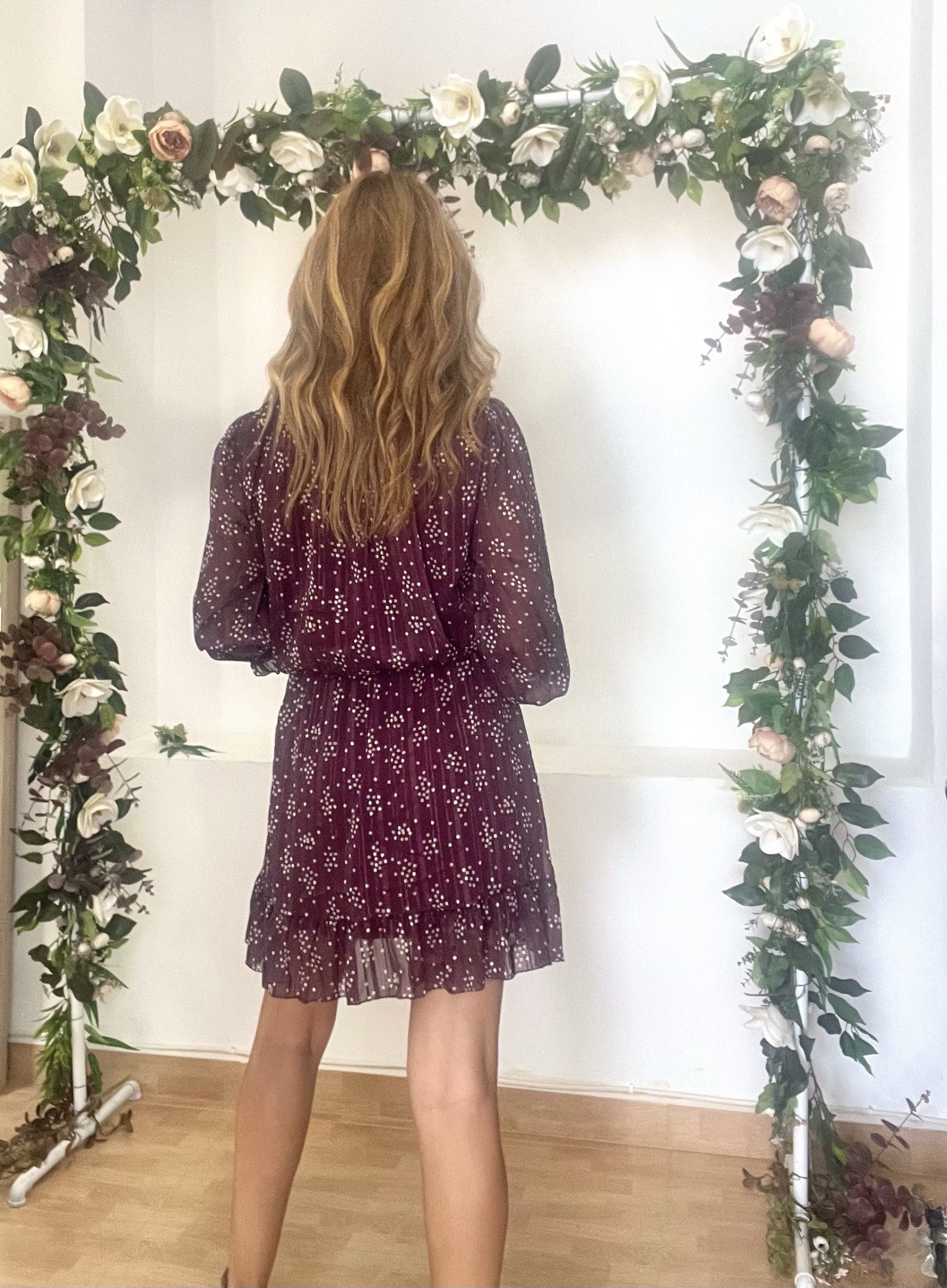 Vestido corto, detalle cuello para atar o dejar suelto con tiras, va forrado, manga acaba en goma, talla desde 34 hasta talla 40. Goma en la cintura.